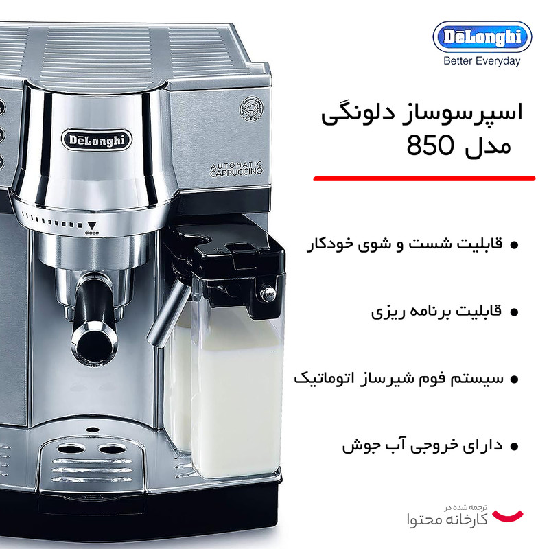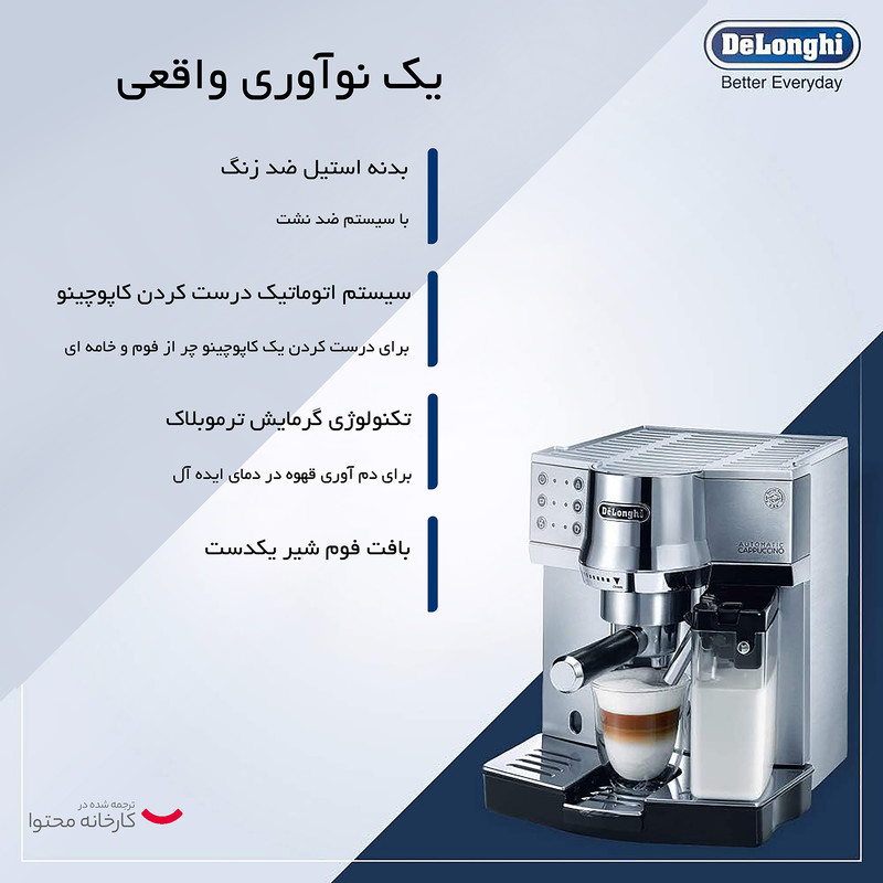 اسپرسو ساز دلونگی مدل EC850M، یکی از بهترین و مورد علاقه مصرف کنندگان اسپرسوهای خانگی است. این دستگاه با طراحی شیک و زیبا، قابلیت تهیه اسپرسو با طعم و عطری مطلوب را به شما میدهد. اسپرسو ساز دلونگی مدل EC850M با قدرت 1450 وات و فشار 15 بار، توانایی استخراج قهوه ای با کیفیت بالا را دارد. همچنین، این دستگاه دارای صفحه نمایش LCD و کاربری آسان است. با کنترل دما، شما میتوانید دمای اسپرسو را به دلخواه خود تنظیم کنید و اسپرسویی با طعم مطلوب بسازید. با استفاده از این دستگاه، میتوانید اسپرسوهای مختلفی از جمله اسپرسو، کاپوچینو، لاته و موکا سازی کنید. همچنین، دستگاه دارای یک پایه برای گرم نگه داشتن فنجان اسپرسو است که باعث میشود اسپرسو شما در دمای مطلوب و بهترین شکل سرو شود. در کل، اسپرسو ساز دلونگی مدل EC850M، یکی از بهترین و جذابترین دستگاههای تهیه اسپرسو برای استفاده در منزل و یا محیطهای کاری است. با داشتن این دستگاه، میتوانید به سادگی و با کیفیتی بالا، اسپرسویی با طعم مطلوب بسازید و لذت بخشید.