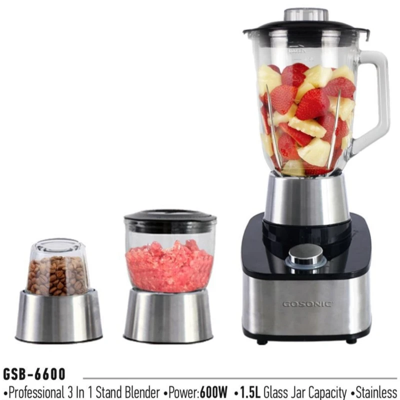 مخلوط کن گوسونیک مدل GSB6600 با ظرفیت ۱٫۵ لیتر و توان ۶۰۰ وات یک دستگاه چندکاره است که برای مخلوط کردن، آسیاب و خرد کردن طراحی شده.